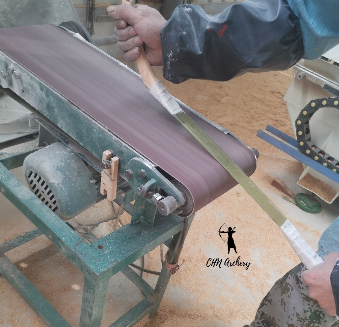 The bowmaker polishing bamboo chip on the polishing machine. After the bamboo chip is polished thin, it is laminated with fiberglass or other materials.