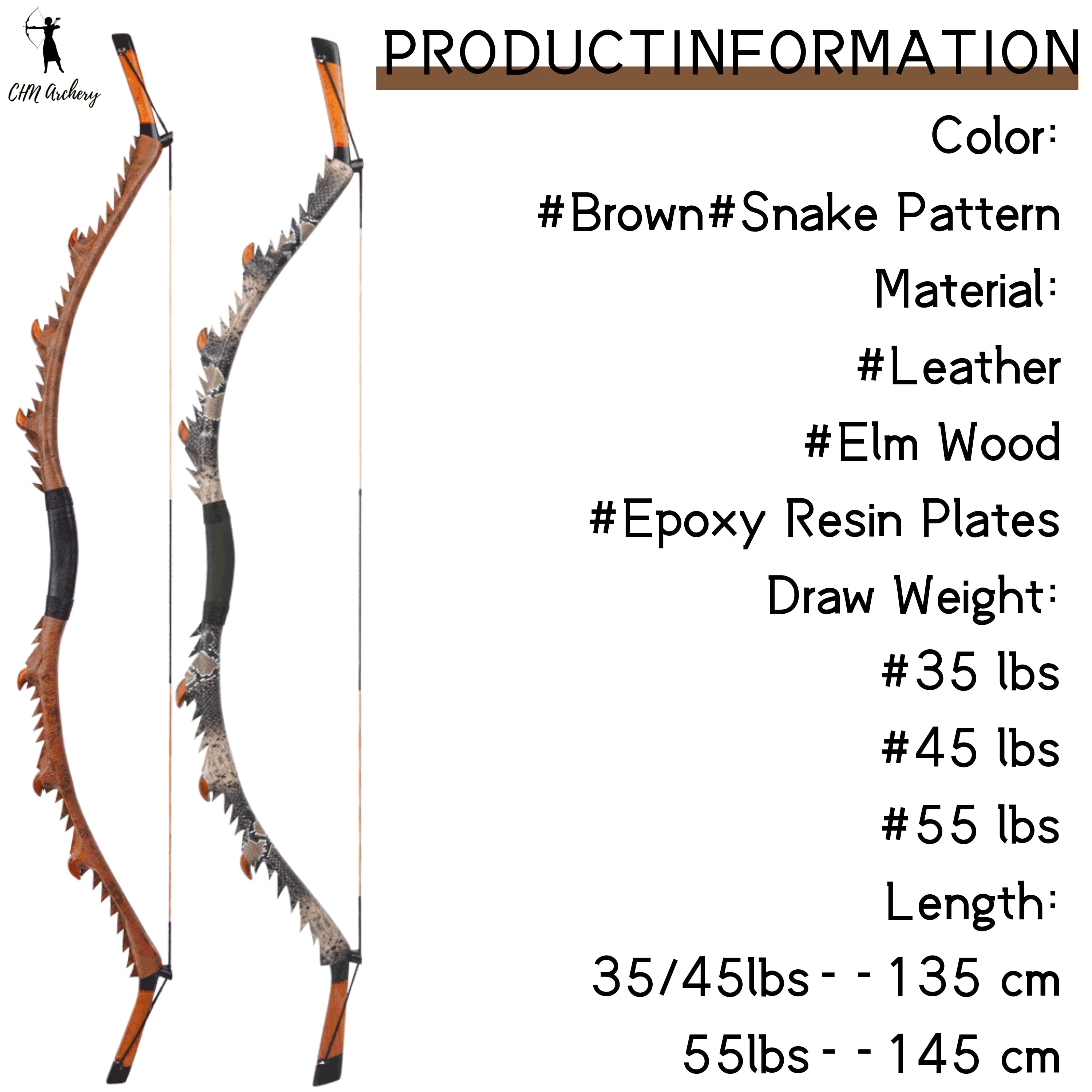 Specification Detail Draw Weight Options 35 lbs, 45 lbs, or 55 lbs (selected at purchase) Bow Type Takedown Recurve (Split Limb Design) Bow Length Approx. 135 cm (35/45 lbs models) / 145 cm (45 lbs variant) Bow Weight Approximately 908 g (without accessories) Riser Material Elm wood with leather grip wrapping Limb Material Wood-epoxy resin laminate String 14-16 strand Dacron string (included, length varies by model) Finish Natural wood grain with protective coating Best For Traditional archery, field shooting, hunting practice, beginner training