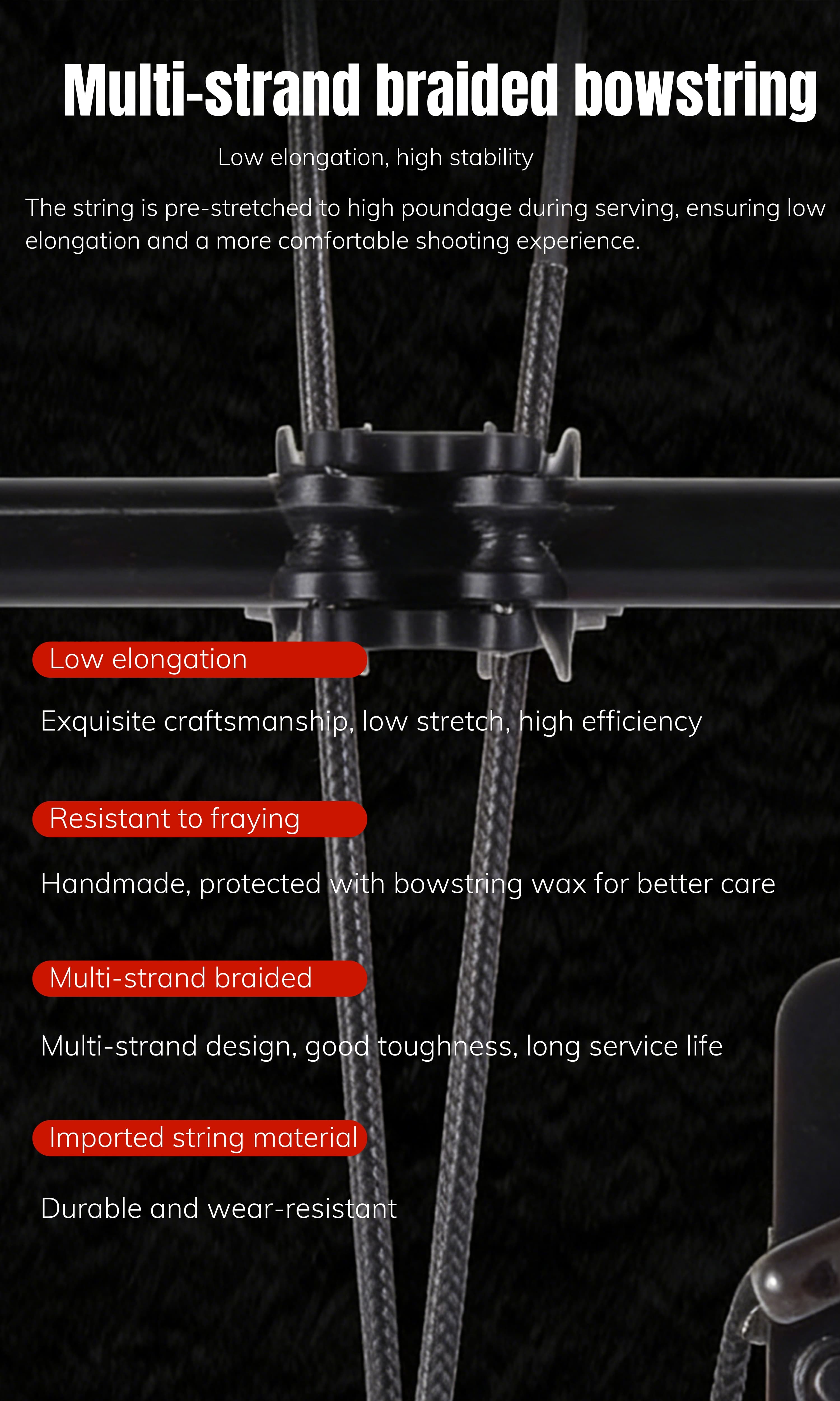 - The multi-strand braided bowstring offers low stretch and high stability.