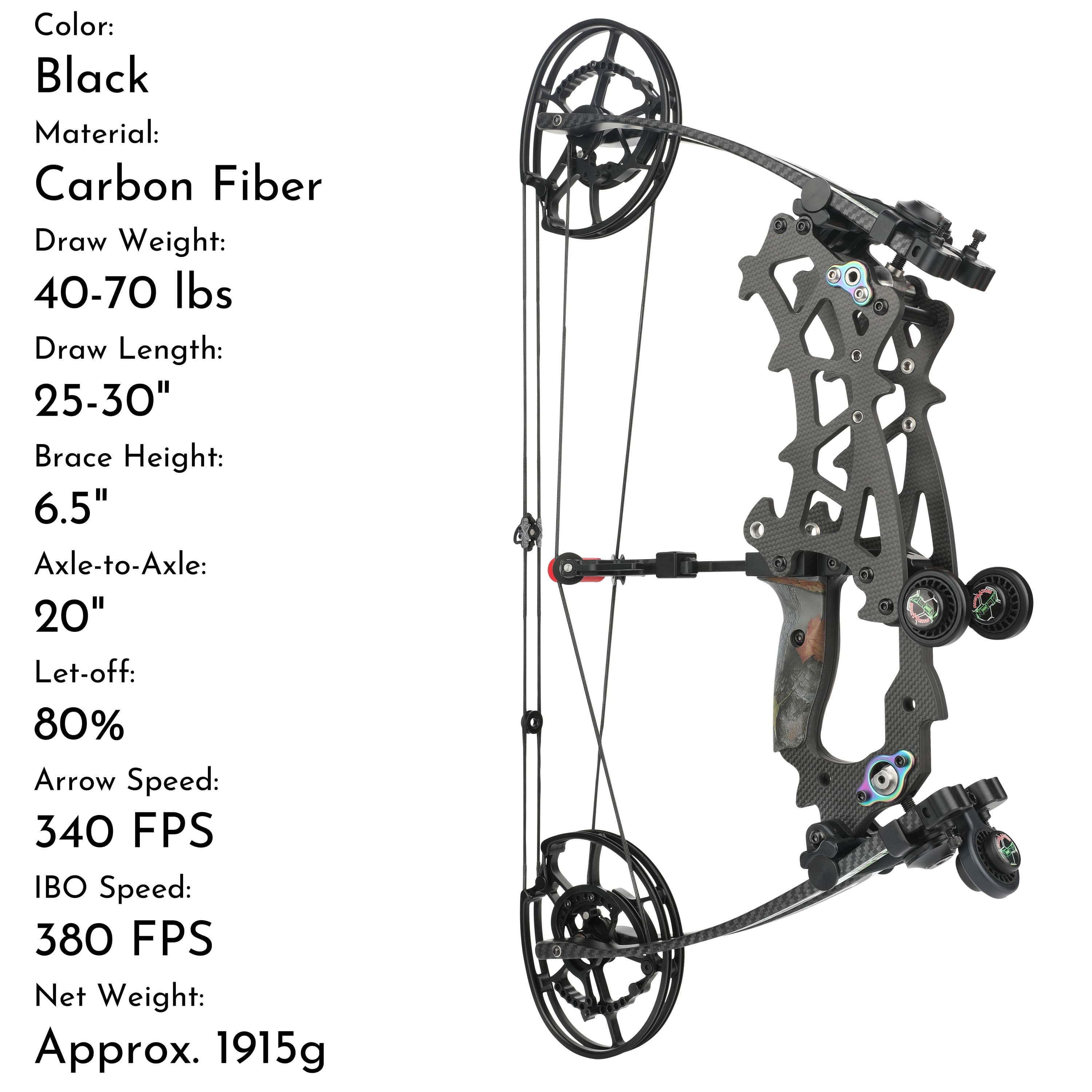 Compact & High-Speed Design: With an ultra-short 20-inch axle-to-axle length for excellent maneuverability, combined with 340 FPS high arrow speed and 80% high let-off, it delivers powerful hunting kinetic energy.
