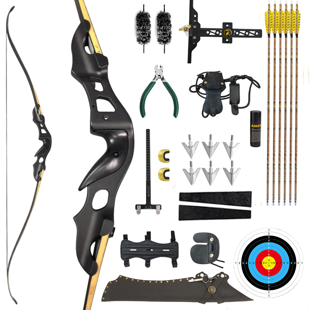 Package includes: 1 riser, 2 limbs, 1 bowstring, 2 string silencers, 2 limb silencers, 1 finger tab, 1 arm guard, 4 brass nock points, 1 recurve sight, 1 arrow rest, 1 bow stringer, 1 T-square,1 x Copper Button Clamp Tool,6 x Blade Broadhead,6 carbon arrows,10 target paper