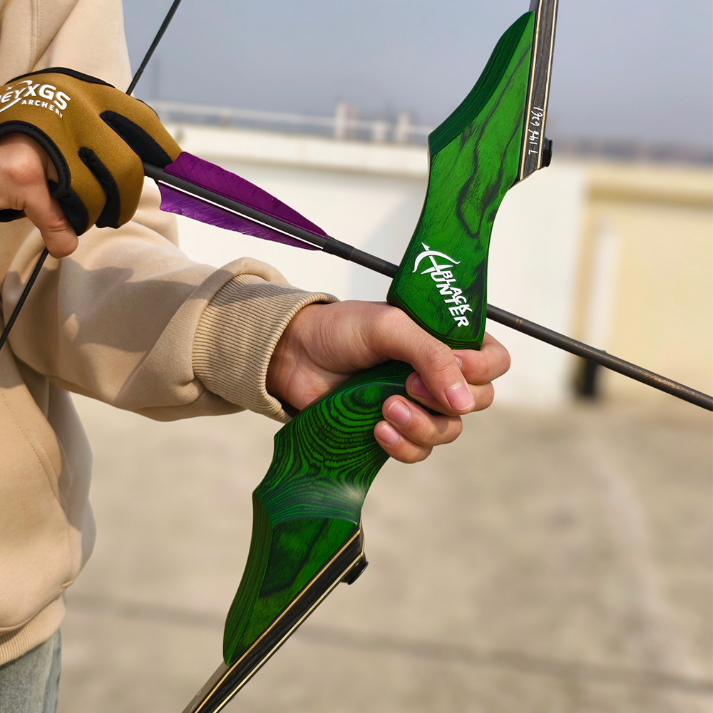 The Black Hunter Recurve Bow is composed of a comfortable laminated high-tech wooden bow handle, bamboo core/fiberglass laminated bow arms and DSM bowstring.