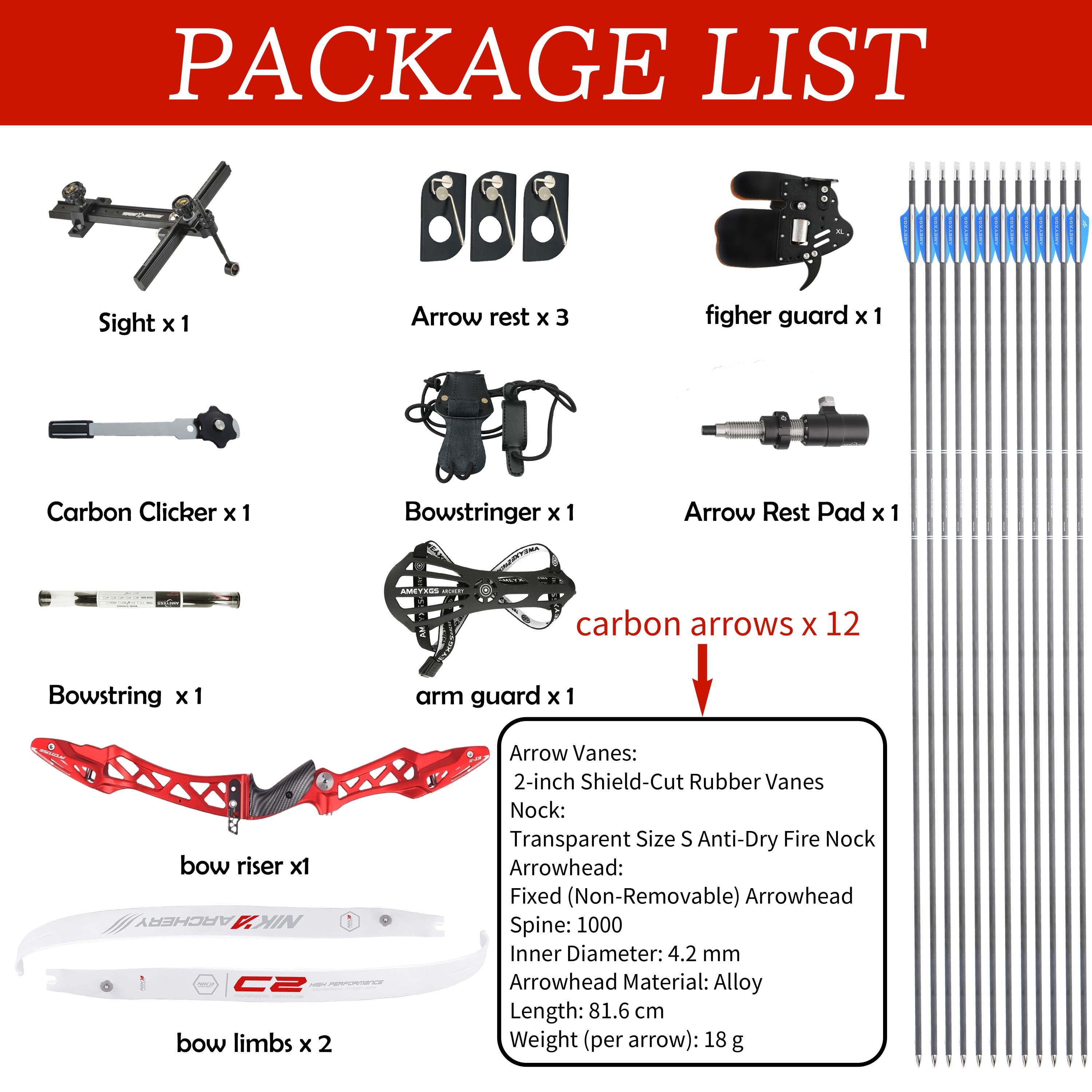 2. Aiming and shooting accessories: Sight × 1, Arrow rest × 3, Arrow Rest Pad × 1, Carbon Clicker × 1