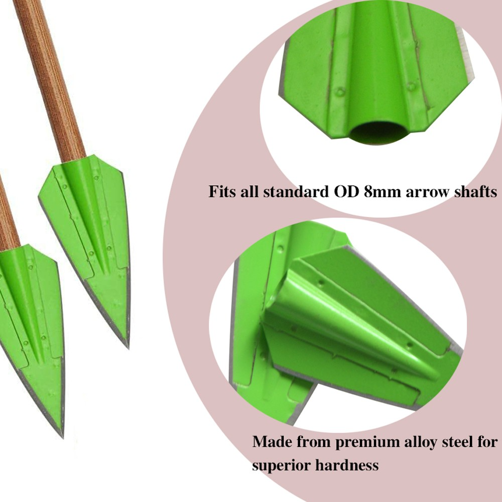 Professional green broadhead arrow tips crafted from sharpened alloy steel.