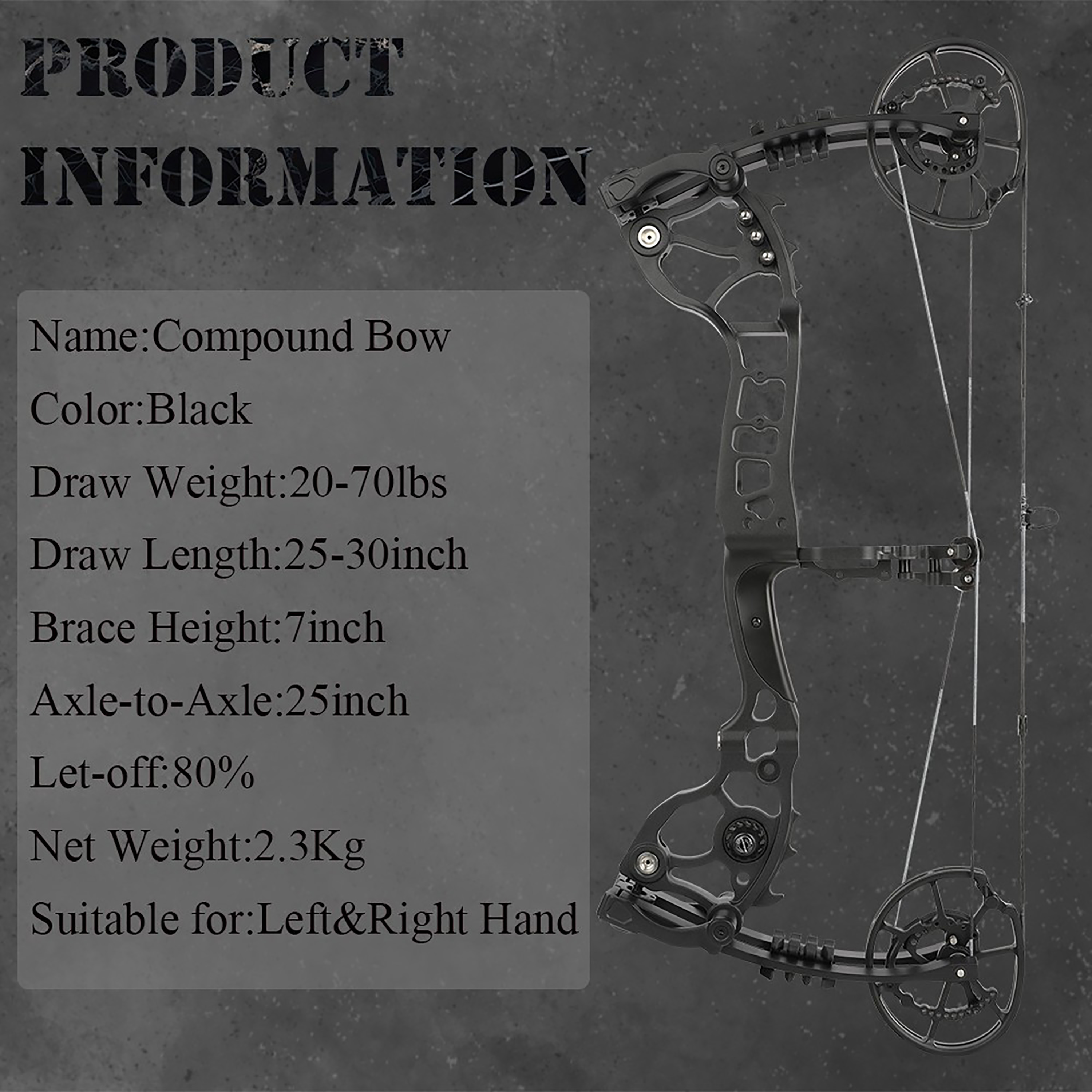 2.Compact and Maneuverable Design – With an axle-to-axle length of 25 inches and a brace height of 7 inches, this bow offers a balance of stability and portability, ideal for hunting and field shooting in tight spaces.