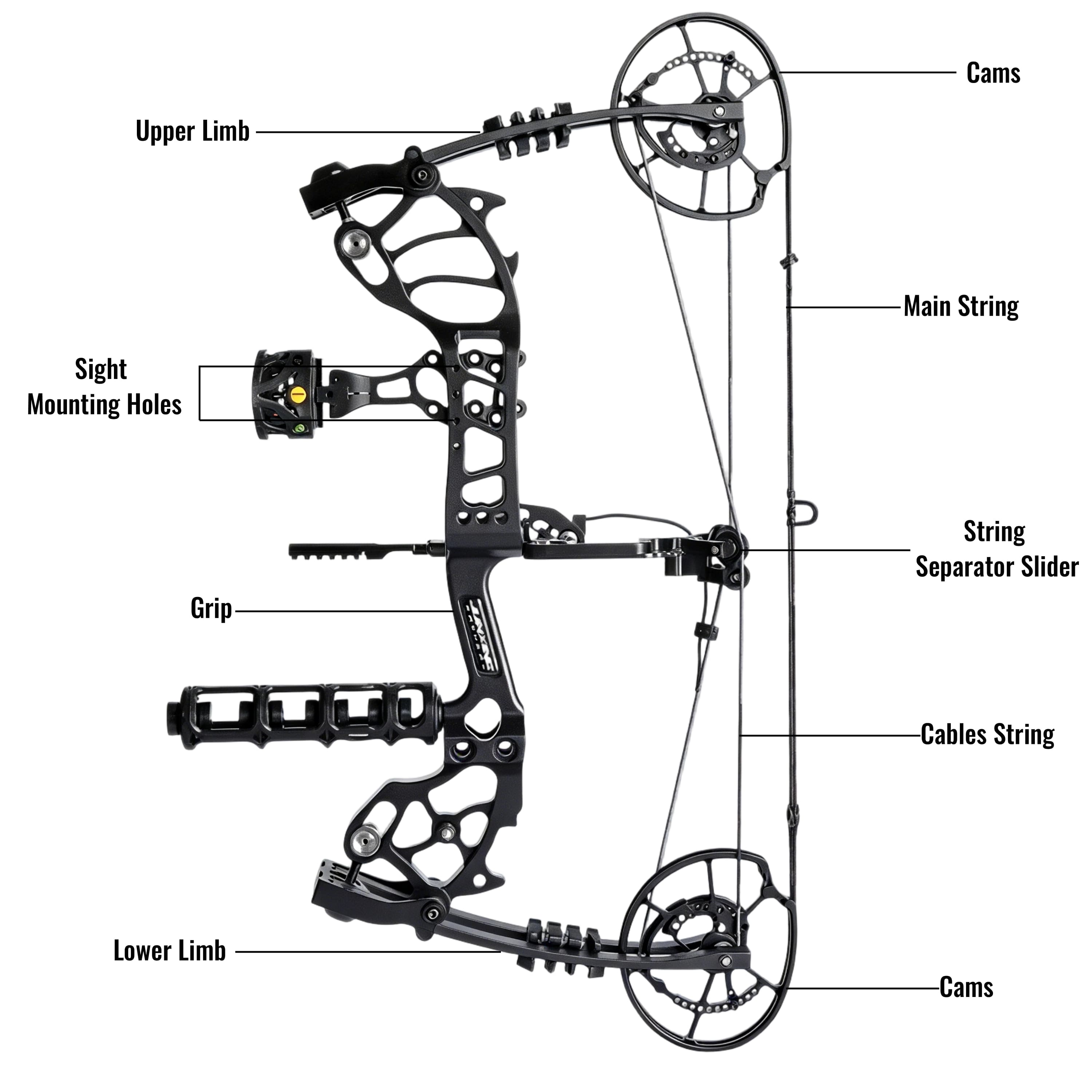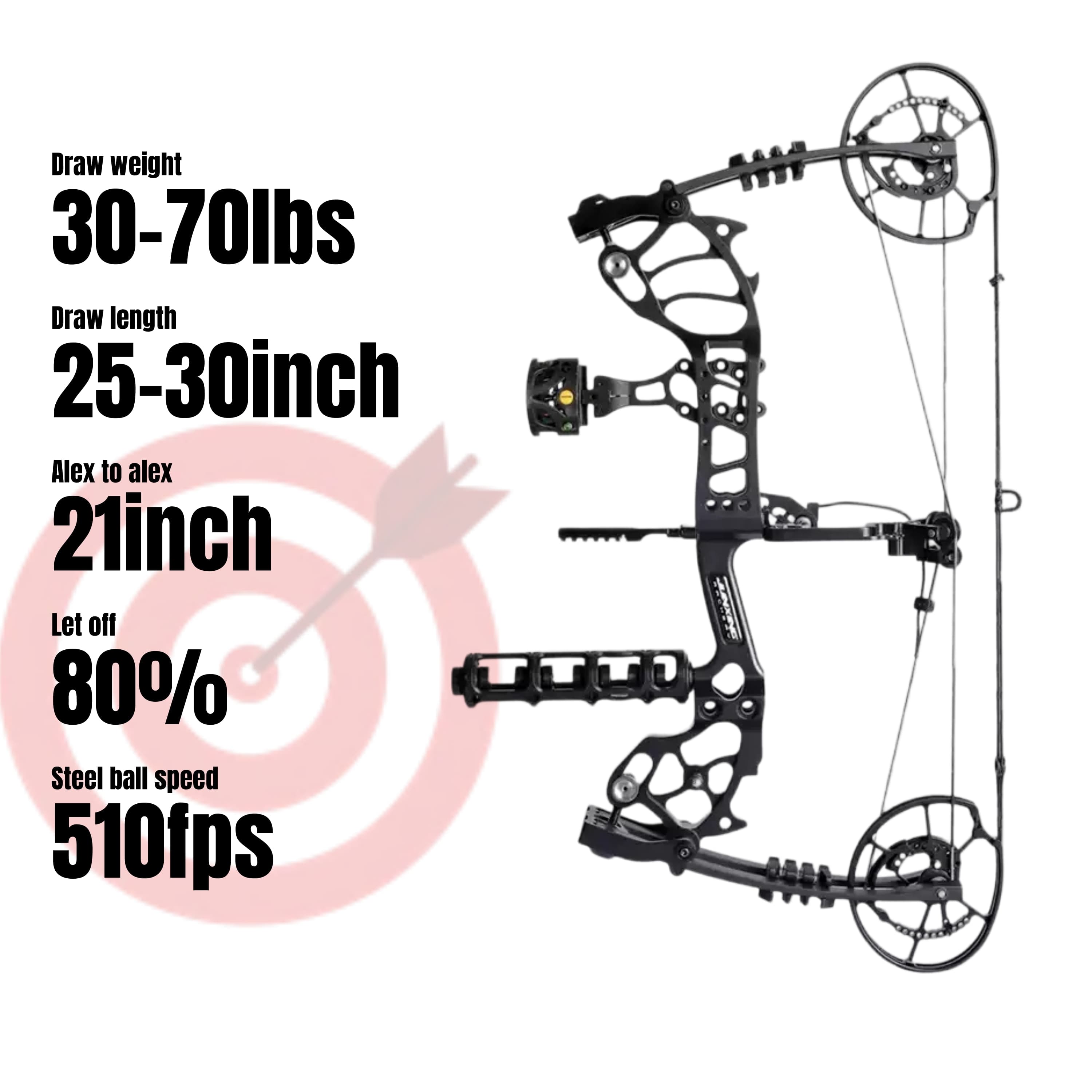 - Precision CNC-Machined Aluminum Body delivers exceptional durability and accuracy. Coupled with an adjustable 30-70 lbs draw weight and blistering 510 FPS bolt speed, this bow is engineered for unmatched power and long-range performance in both hunting and target practice.