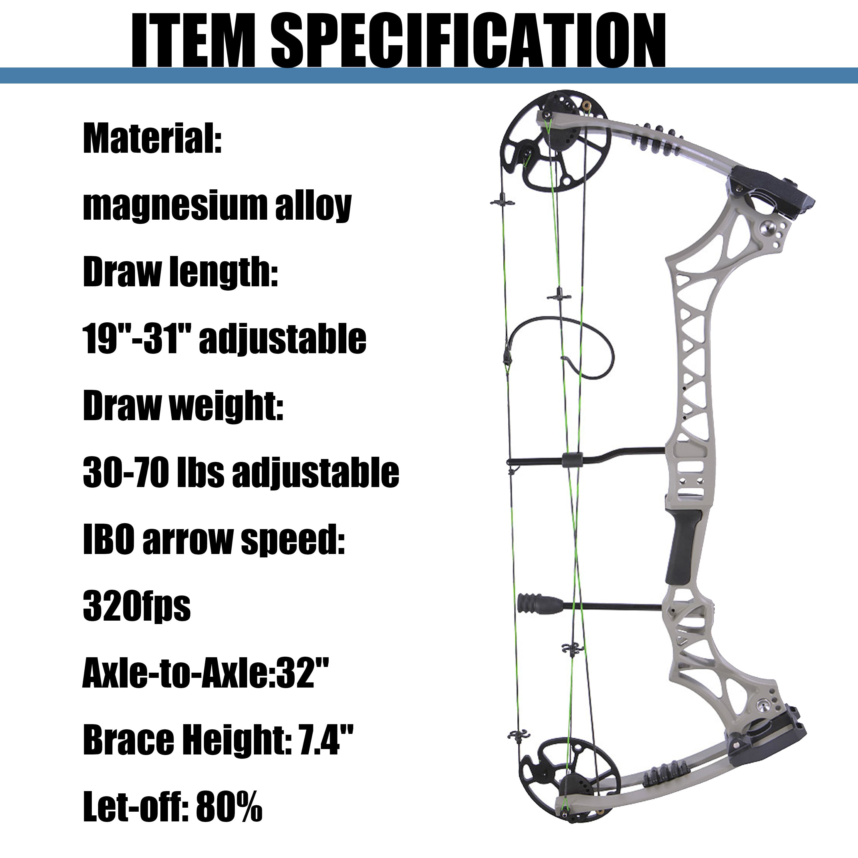 - Draw Weight: 30-70 lbs, adjustable