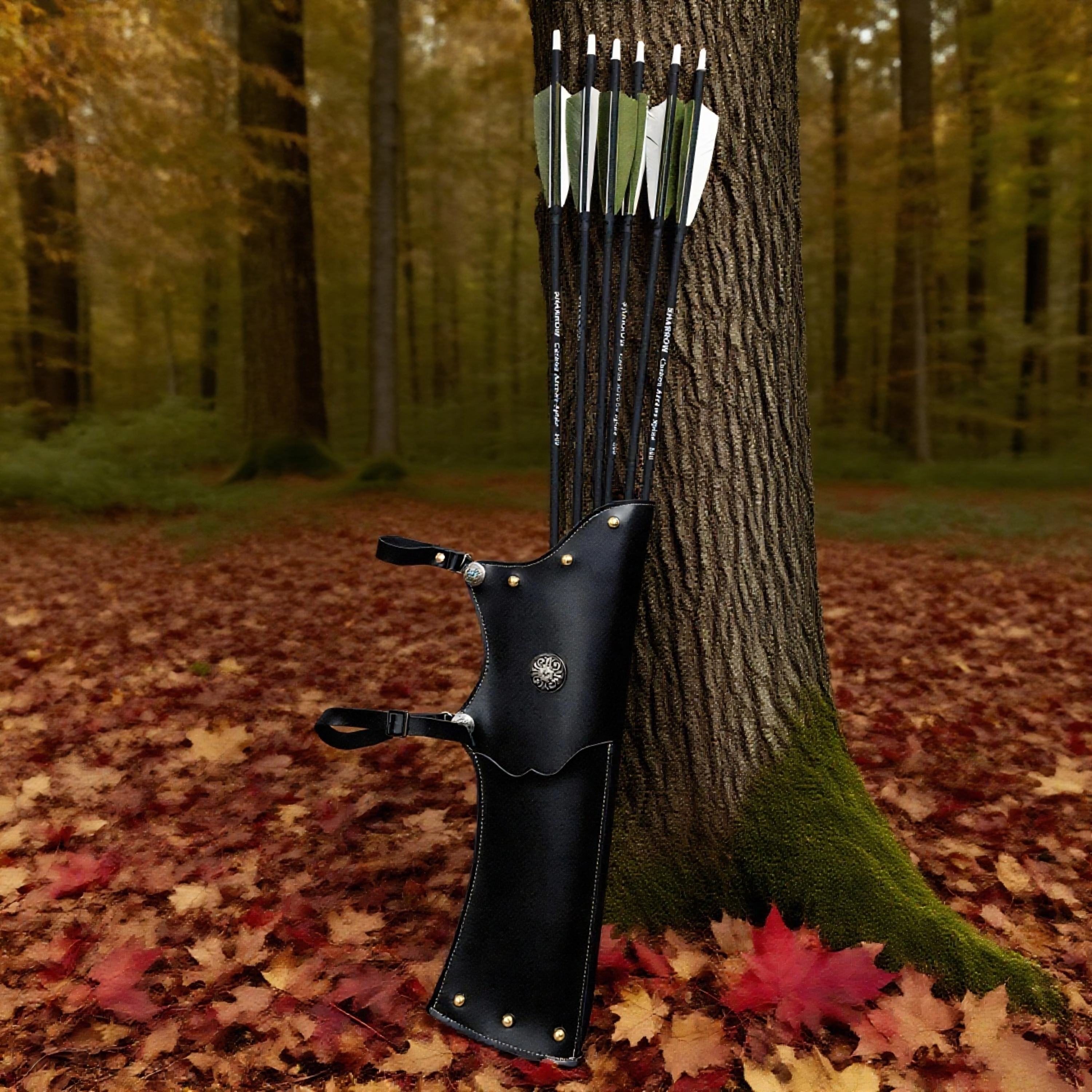 The quiver can be worn with a simple buckle webbing or a leather belt (belt not included), and arrows can be drawn either forward or backward depending on your shooting habits.