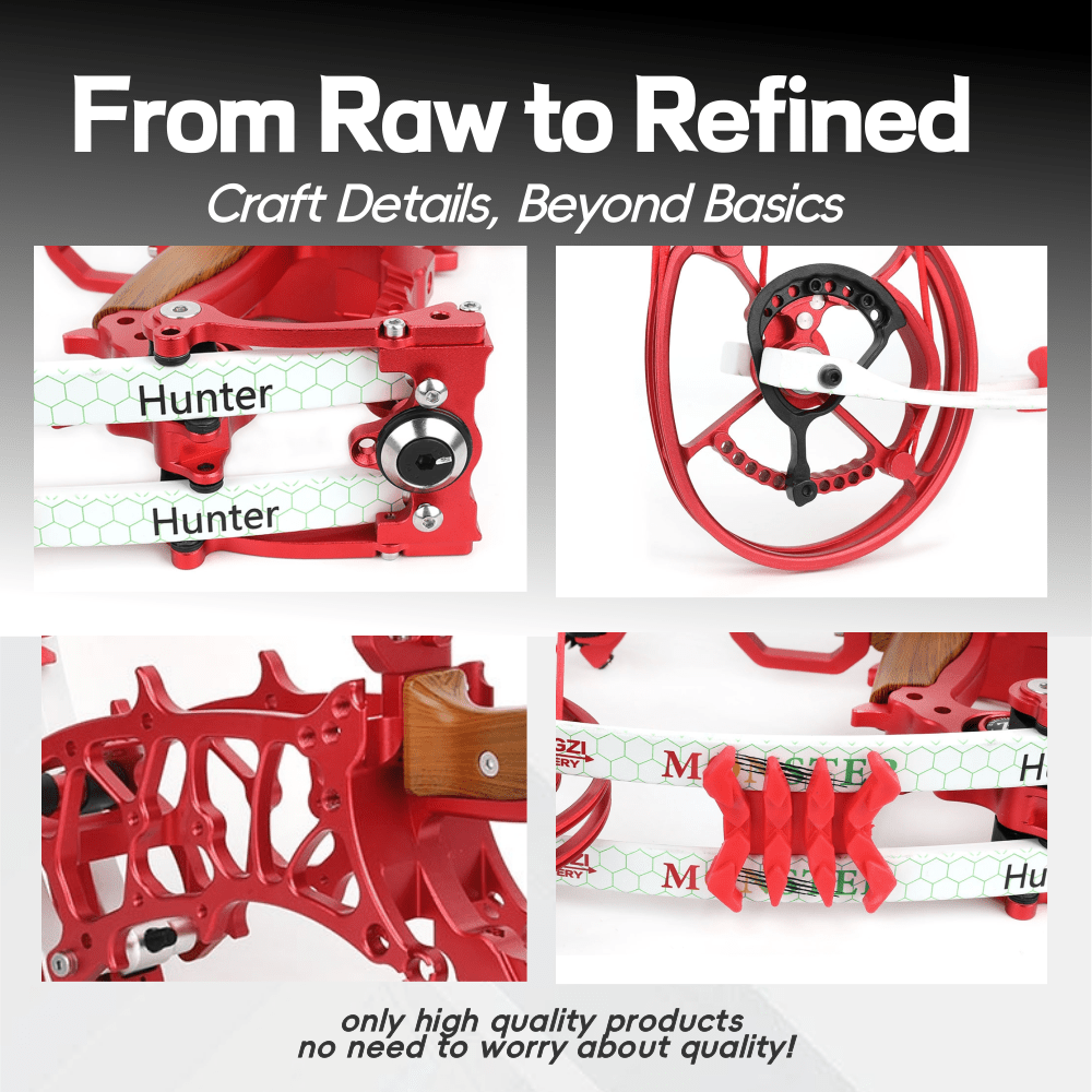 6061-T6 aircraft aluminum (CNC-machined, screw-free design) Limbs: USA-made Gordon laminated fiberglass Pulleys: 7075 aviation-grade aluminum