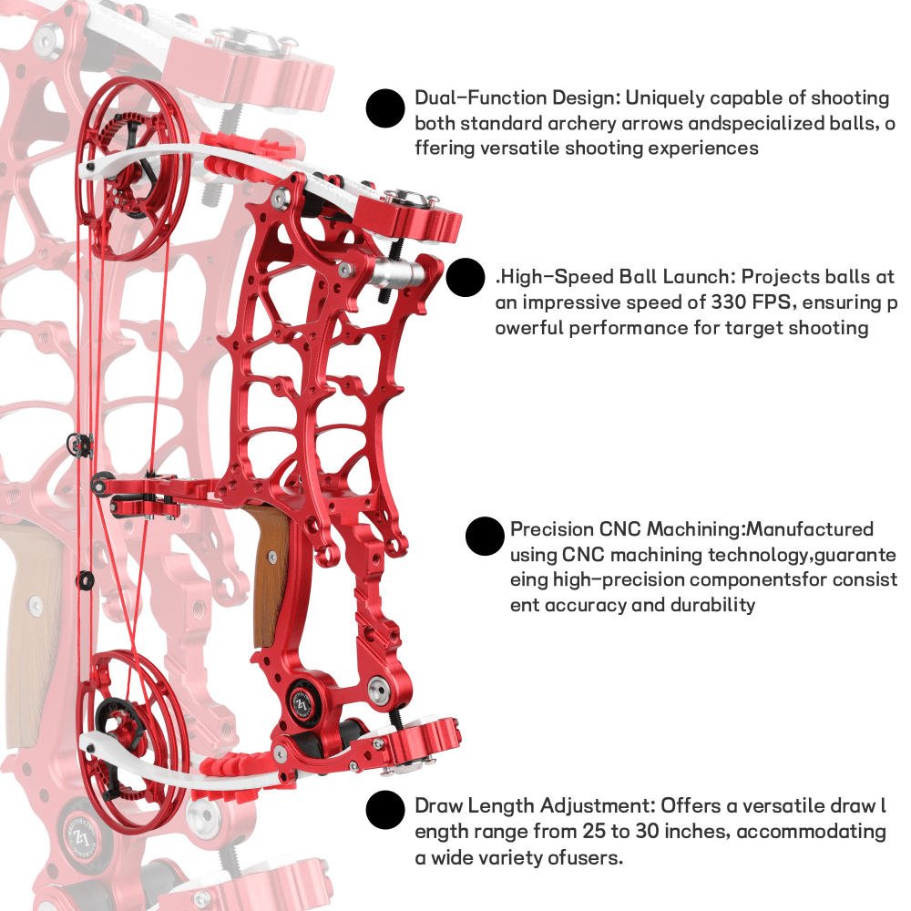 330fps speed (with 12mm steel balls) 80% let-off + 25-30" adjustable draw length Laser guide rail (compatible with flashlights/laser sights)