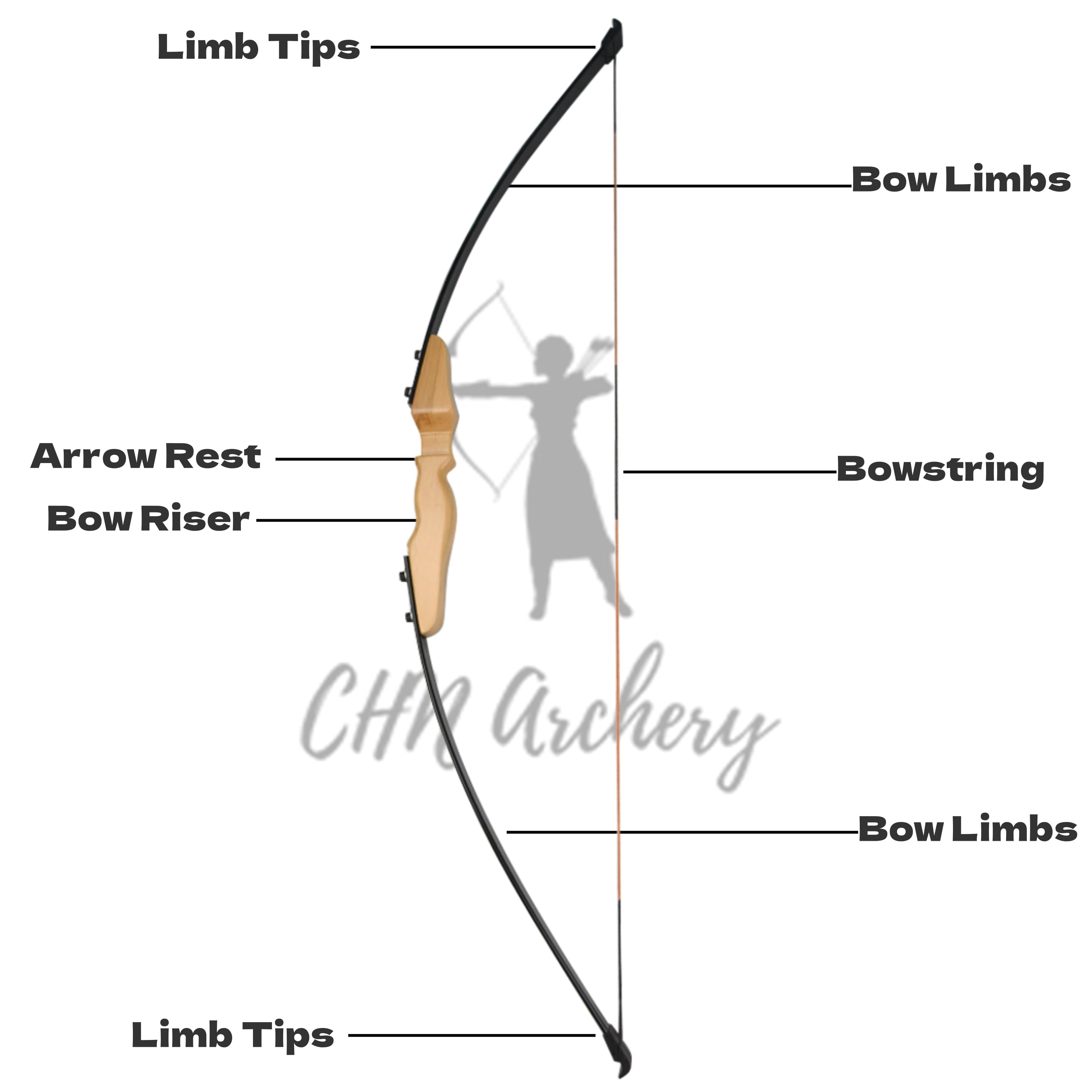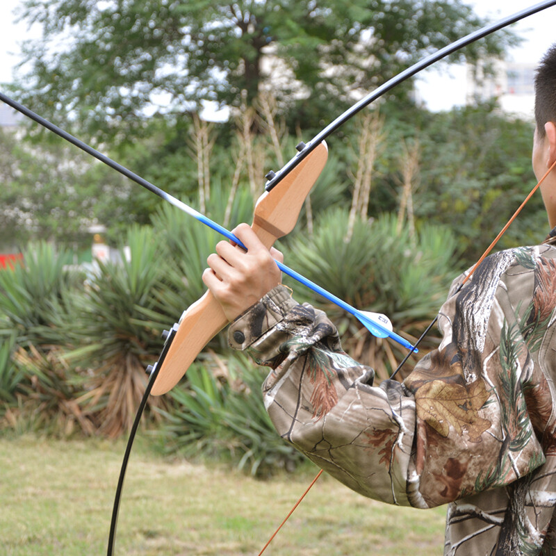 Configured to be held in the left hand with the string drawn by the right hand, following standard archery form.