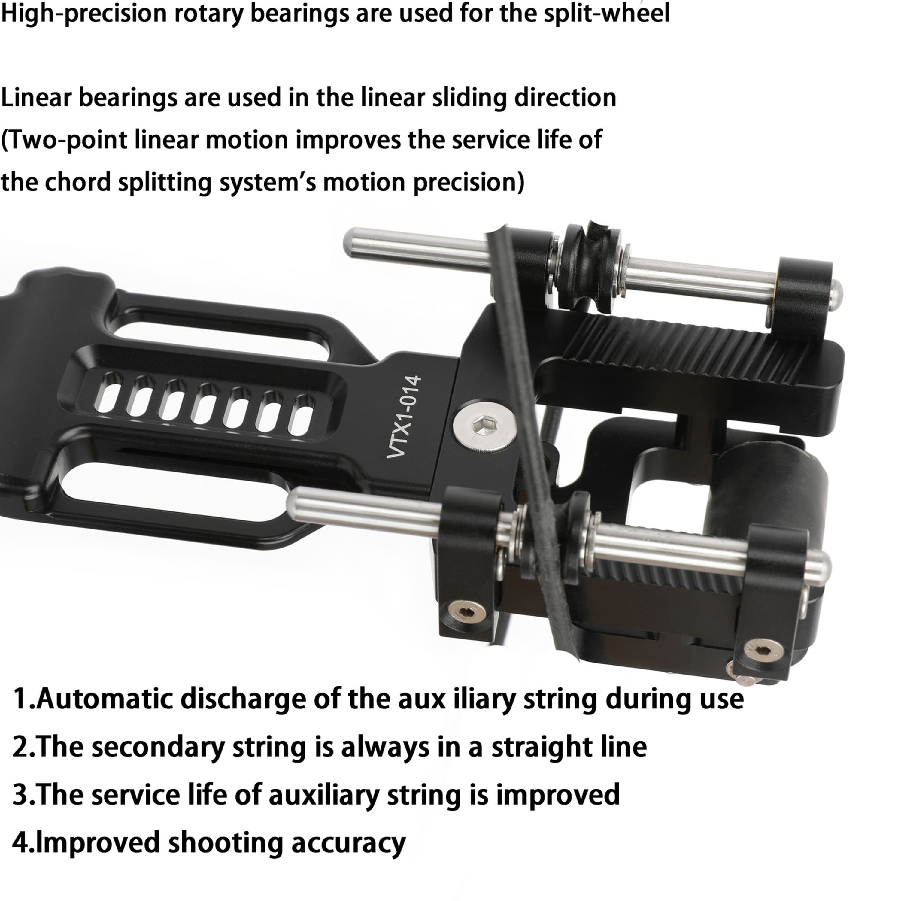 The sliding chord splitter automatically releases the auxiliary string during shooting while maintaining a straight alignment, improving accuracy and extending string life.